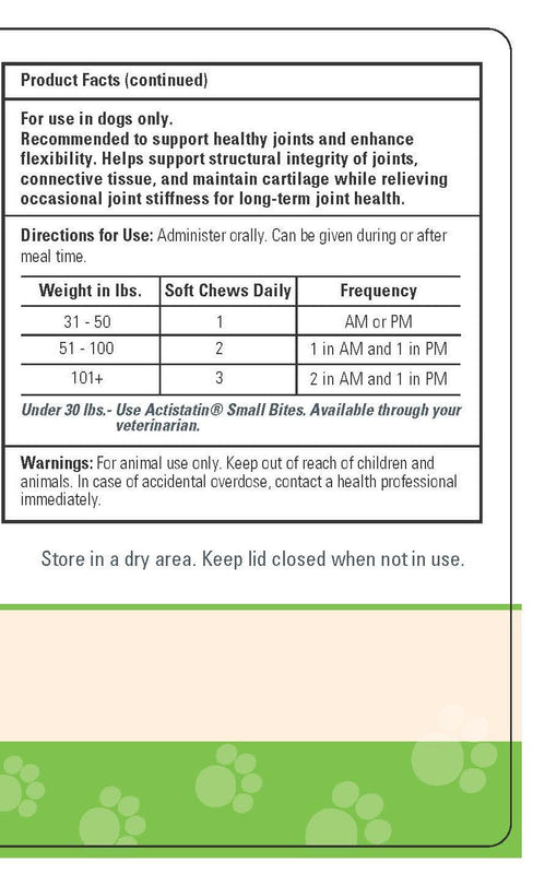 • HIP AND JOINT SUPPLEMENT - Actistatin canine large dog 120 soft chews is the very finest Glucosamine for dogs on the market today. Our Glucosamine Chews are a delicious joint supplement for dogs that is formulated for maximum absorption into your dogs bloodstream faster, for quick natural enhancer. Our daily moist bites hip and joint dog chew treat for small or large breed works as a powerful joint relief for dogs and will have your pets begging for more
